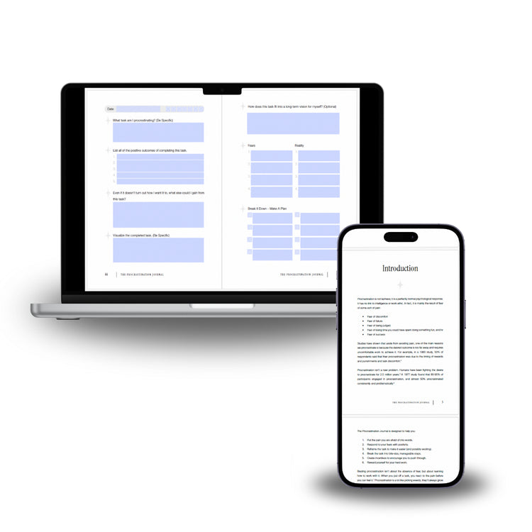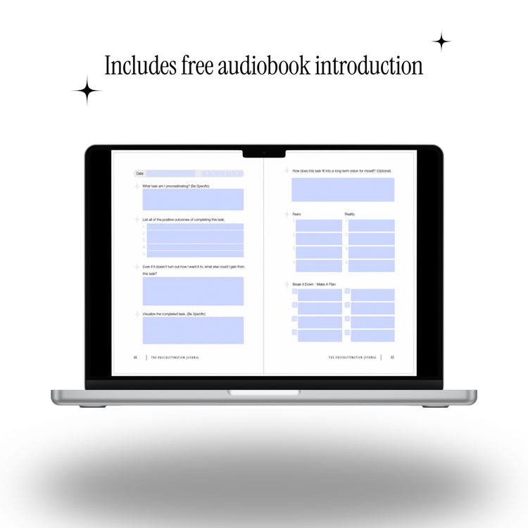 The Procrastination Journal includes 60 entries and is available as a hardcover or digital download. The Procrastination Journal also comes with a free audiobook of the introduction.